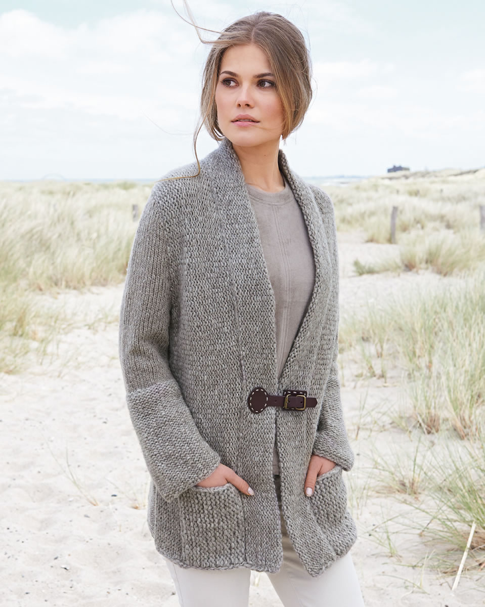 Lana Grossa-Qualität „Merino Air” (90 % Schurwolle (Merino), 10 % Polyamid, LL = ca. 130 m/50 g): ca. 200 (250– 300) g Taupe (Fb. 10) und Lana Grossa- Qualität „Yak Merino” (30 % Schurwolle (Merino), 28 % (Baby) Alpaka, 22 % Polyamid, 20% Yak, LL = ca. 110 m/50 g): ca. 300 (350 – 400) g Grège (Fb.10); Stricknadeln Nr. 5,5, 7 und 9, 1 Rundstricknadel Nr. 7, 80 cm lang; 1 Lederschließe von Union Knopf, Art. 59976, 100 mm, Fb. 20 dunkelbraun.