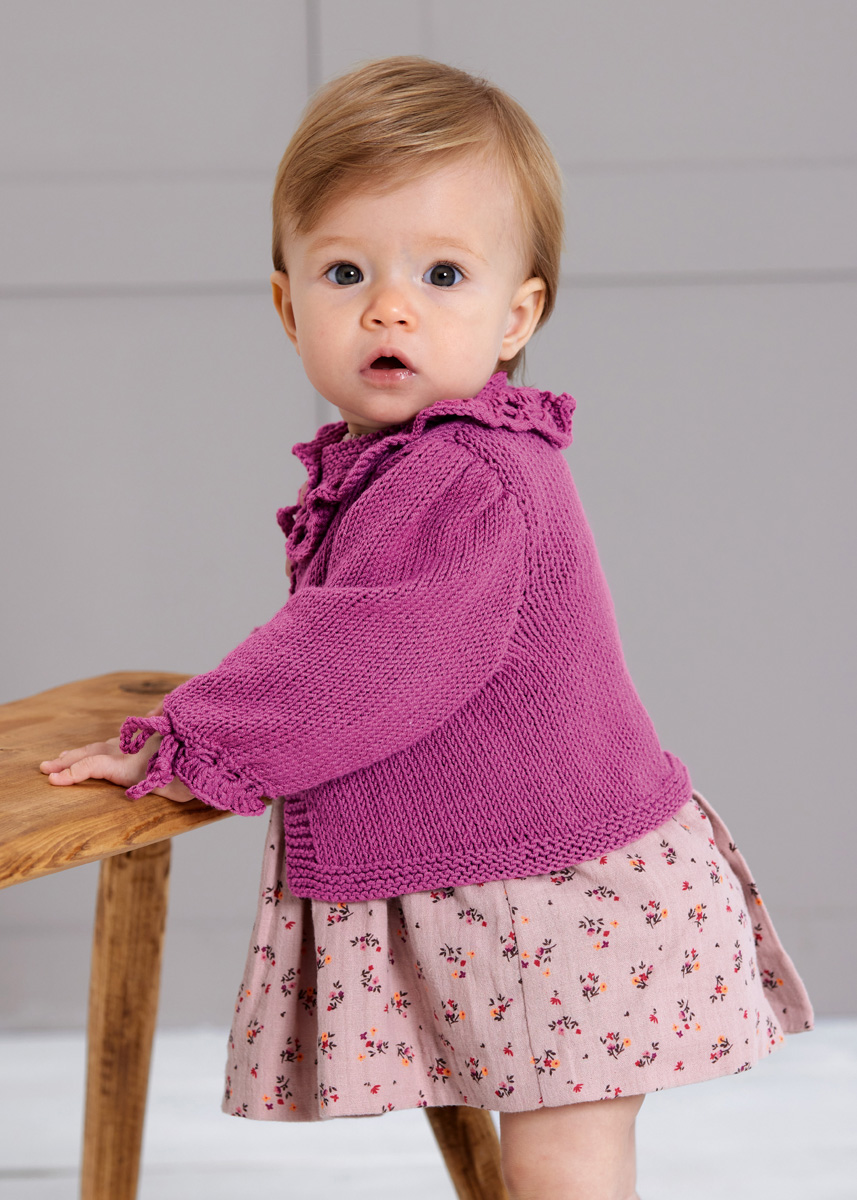 Lana Grossa-Qualität „Elastico“ (96 % Baumwolle, 4 % Polyester (Elité); Lauflänge = 160 m/50 g): 100 (100/150/150) g Fuchsia (Fb 163); Rundstricknadel 3,5 mm; Häkelnadel 3,5 mm; 3 Knöpfe mit 13 mm Ø.
