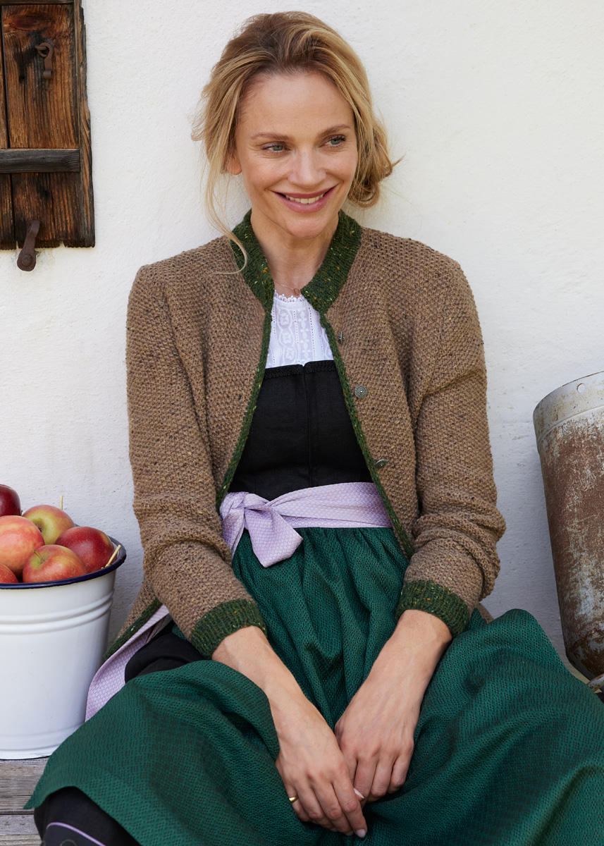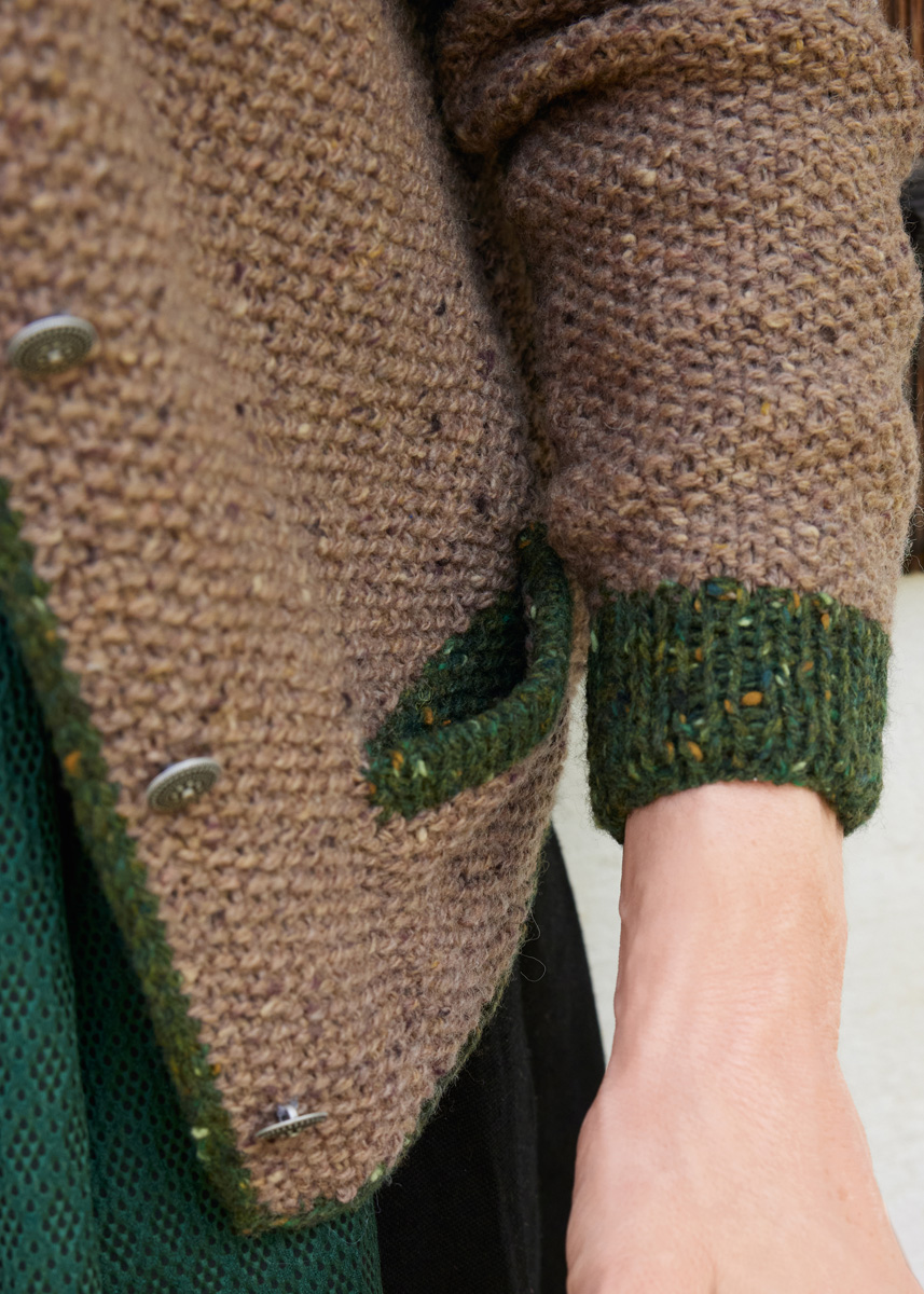 Ein kleines Perlmuster und meliertes Tweed-Garn in natürlichen Farben – so sieht ein klassischer Janker aus. Dazu gibt es einen plastischen I-Cord-Rand und kleine, eingestrickte Taschen.