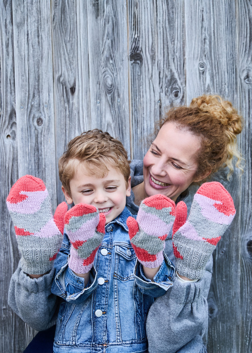 Lana Grossa-Qualität „Landlust- Alpaka-Merino 160“ (50% Schurwolle (Merino), 50% Alpaka (Baby), LL ca. 160 m/50 g), je 50 g in Hellgrau (Fb 407), Rosa (Fb 413) und Hummer (Fb 441); 1 Nadelspiel Nr. 3,5.