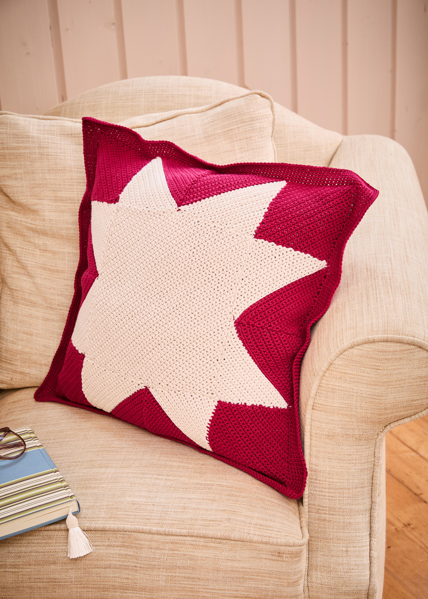 Lana Grossa-Qualität „Landlust- Baumwolle“ (100 % Baumwolle (Bio), LL ca. 115 m/50 g), 250 g in Weinrot (Fb 23) und 200 g in Natur (Fb 3); 1 Häkelnadel Nr. 3,5, 1 Kissenfüllung 50 x 50 cm.