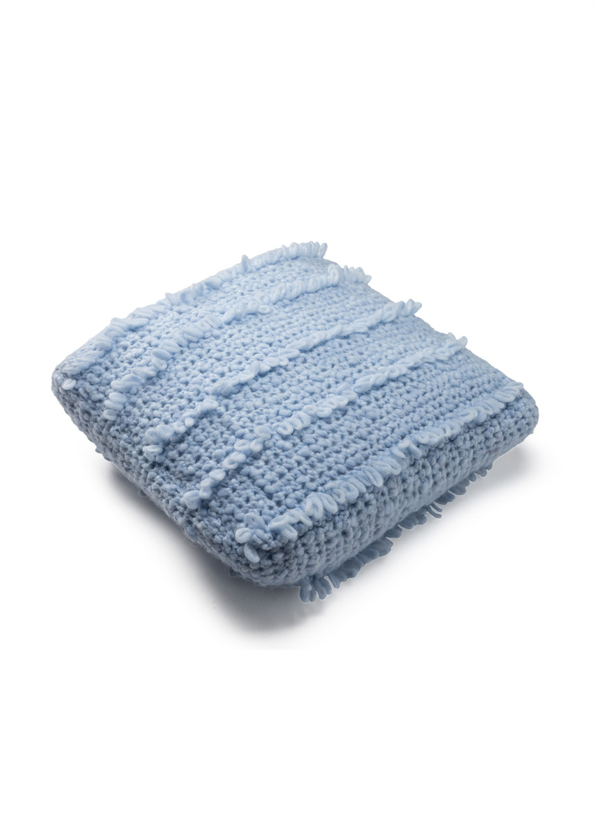 Lana Grossa-Qualität „Caramella” (53 % Schurwolle (Merino), 25 % (Baby) Alpaka, 22 % Polyamid, LL = ca. 110 m/50 g): ca. 200 g Babyblau (Fb. 10); 1 Wollhäkelnadel Nr. 8; 1 waschbare Kissenfüllung, 45 x 45 cm.