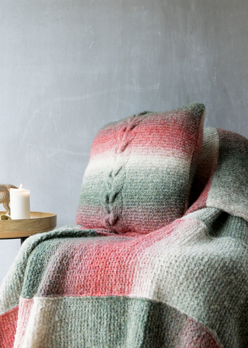 Lana Grossa-Qualität Christmas Edition Gigante Lurex (70% Alpaka (Fine), 30% Polyamid, LL = ca 150 m/50 g): 150 g Rot/Grün/Weiß (Fb 999); Stricknadeln Nr 6; 1 Zopfnadel; 1 waschbare Kissenfüllung 50 x 50 cm.