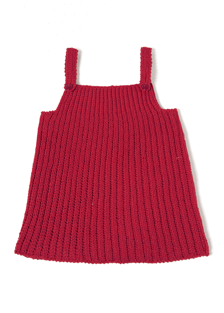 Lana Grossa Alta Moda Cotolana (45% (Pima) Baumwolle, 45% Schurwolle (Merino), 10% Polyamid; LL = 150 m/50 g): 100 (150/150/200/200) g Orientrot (Fb. 59); eine Häkelnadel 3,5 mm; 2 farblich passende Knöpfe mit 18 mm Ø.