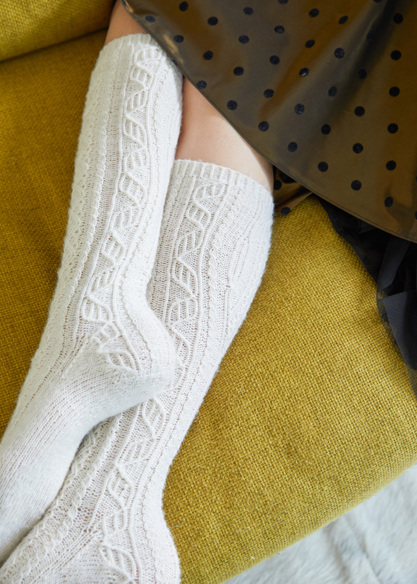 Feinste Handarbeit wie aus dem Lehrbuch! Diese aufwändigen Kniestrümpfe mit filigranem Zopfmuster sind eine wahre Glanzleistung.