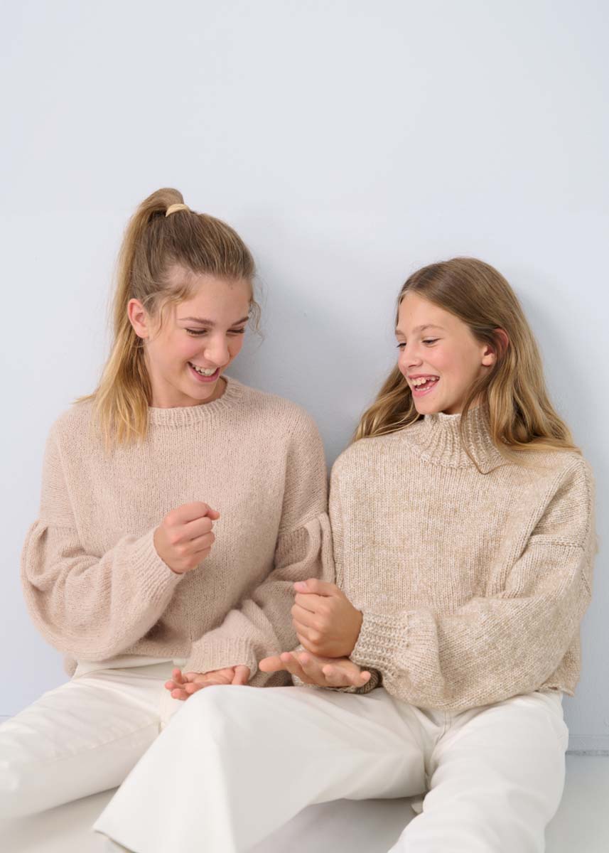 Lana Grossa-Qualität „Twinny“ (97% Schurwolle (Merino extrafine), 3% Polyamid, LL = ca 100 m/50 g): ca 350 (400 - 400 - 400) g Hell-/Sandbeige (Fb 1); Stricknadeln Nr 4,5 und Nr 5; 1 kurze Rundstricknadel Nr 4,5.