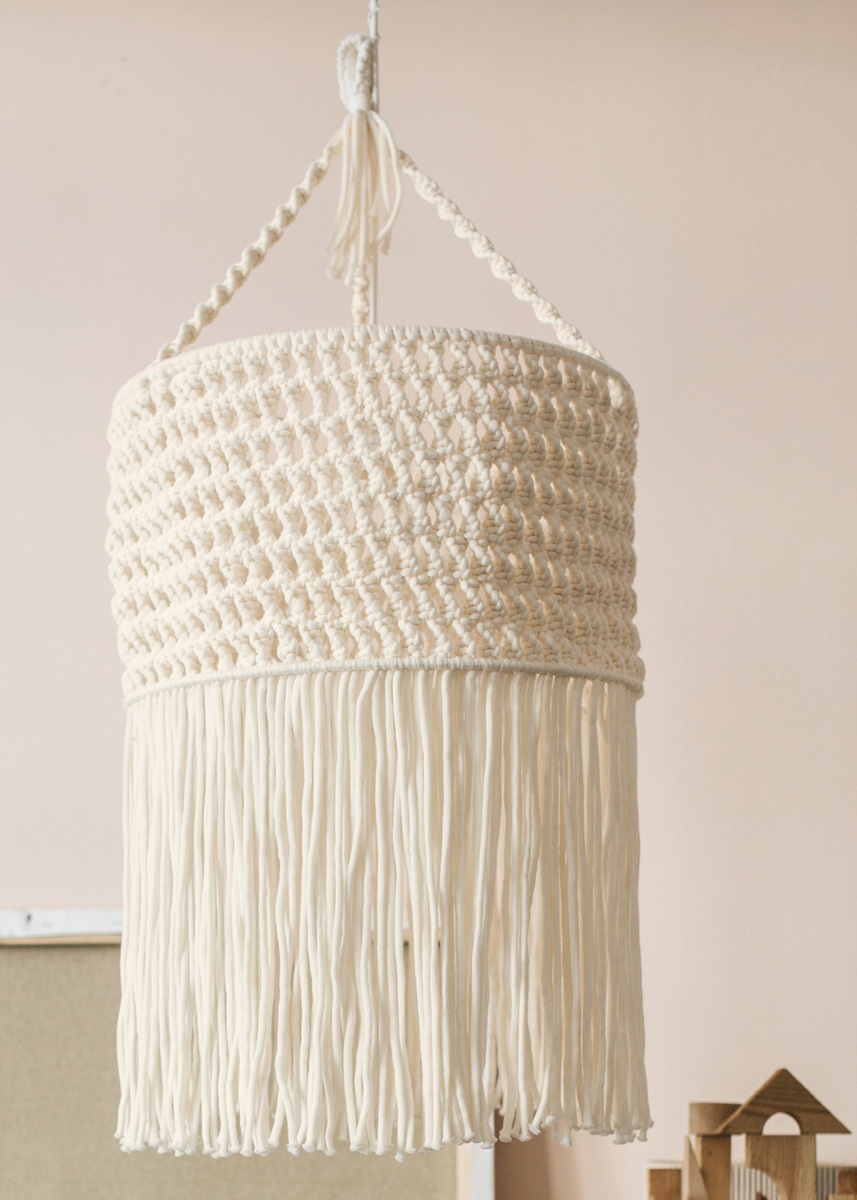 Der helle, unifarbene Makramee-Schirm beschert Ihrem Zuhause dezenten Hippie-Flair. Er hat einen Durchmesser von 40 Zentimetern. Geknüpft wird er aus The Tube, einem neuen, voluminös wattierten Schlauchgarn.