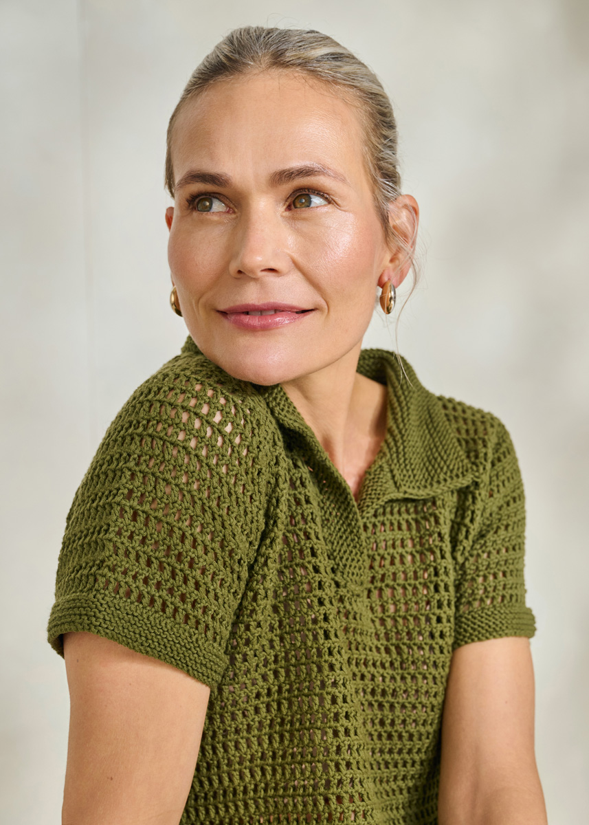 Lana Grossa Landlust Baumwolle (100% Baumwolle (Bio), Lauflänge 115 m/50 g), 500 (550 – 600) g Moosgrün (Fb. 32); 1 Häkelnadel Nr. 3,5 und 1 Rundstricknadel Nr. 4, 40 und 80 cm lang.
