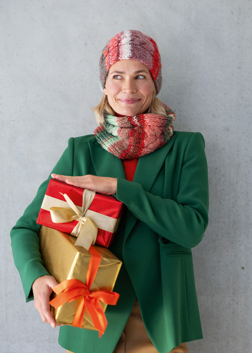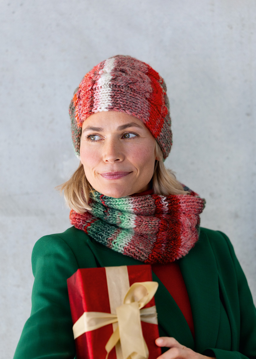 Lana Grossa-Qualität Christmas Edition Big Lurex (60% Schurwolle, 40% Polyacryl, LL = ca 180 m/100 g): 100 g Graurot/Rot/Ecru/Schwarz-/Weißrot/Orange/Dunkel-/Weißgrün/Dunkelgrau/-rot verschieden gestreift (Fb 203); Stricknadeln Nr 6; 1 Zopfnadel.