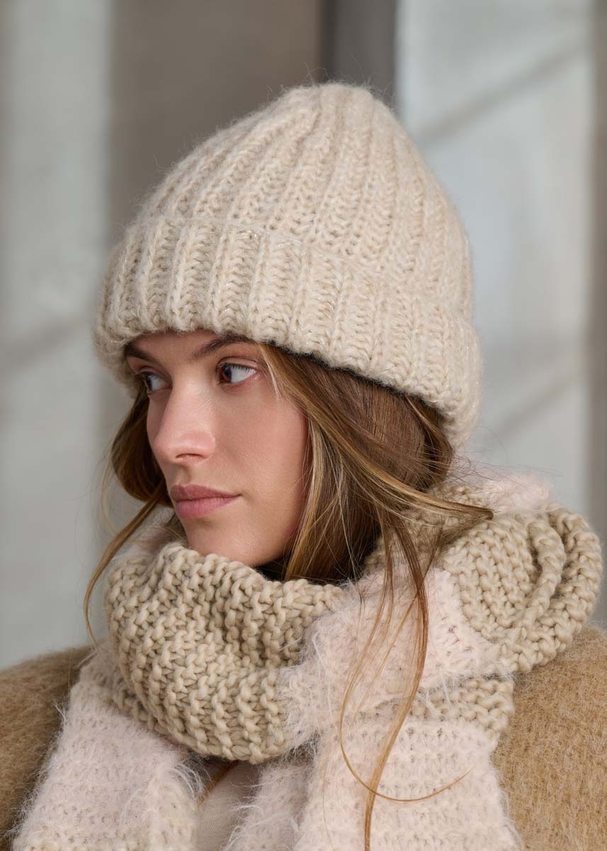 Lana Grossa „Alpaca Air“ (62% Alpaka (Baby), 27% Polyamid, 11% Schurwolle (Merino Fein) LL= ca. 140 m/50 g), ca. 50 g Beige (Fb. 2) ODER ca. 50 g Jadegrün (Fb. 24); „Brillino“ (83% Viskose, 17% metallische Faser, LL = ca. 200 m/25 g) ca. 25 g Creme/Silber (Fb. 32) ODER ca. 25 g Grün/Silber (Fb.43); eine Rundstricknadel Nr. 5,5, Länge 40 cm, ein Nadelspiel Nr. 5,5, ein Maschenmarkierer