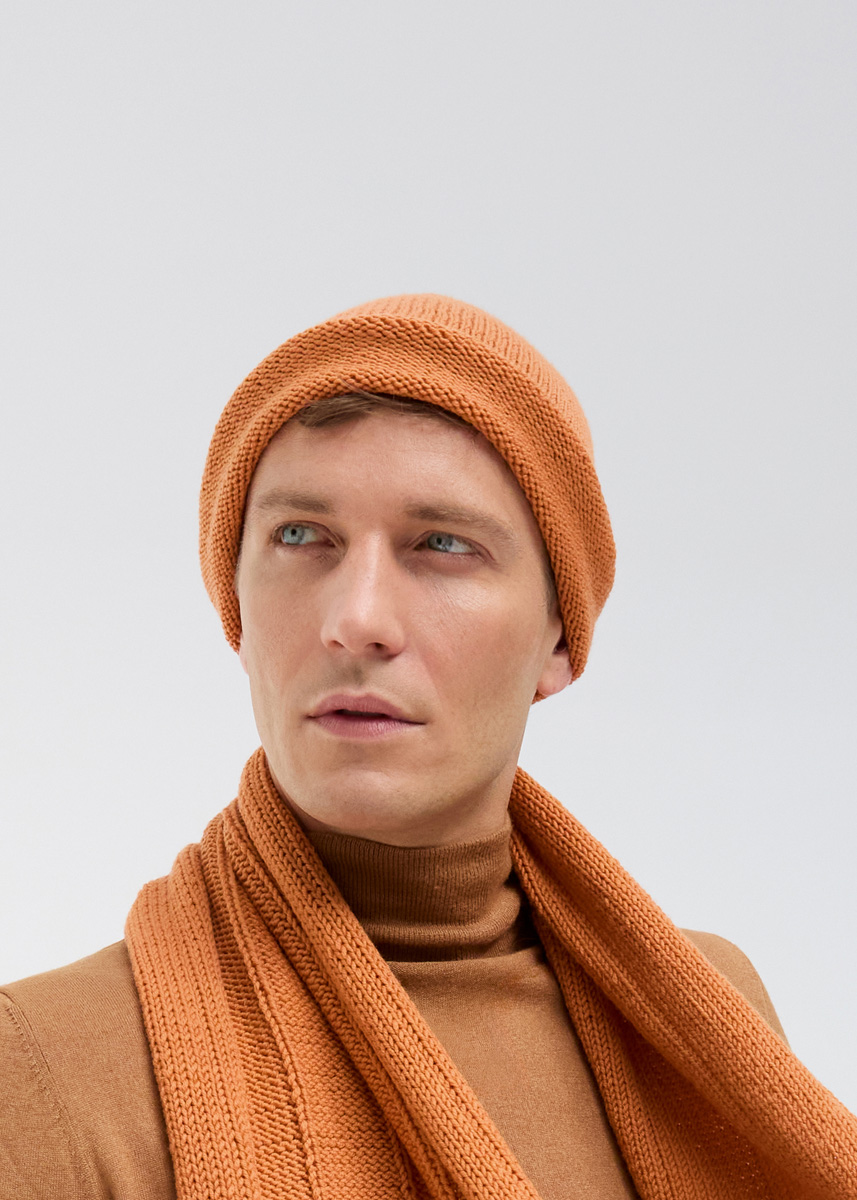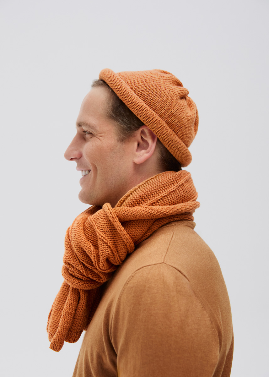 Lana Grossa „Cool Wool“ (100% Schurwolle (Merino extrafine), filzfrei, LL = 160 m/50 g): 100 g Orangebraun (Fb 2116); Nadelspiel Nr 3,5.