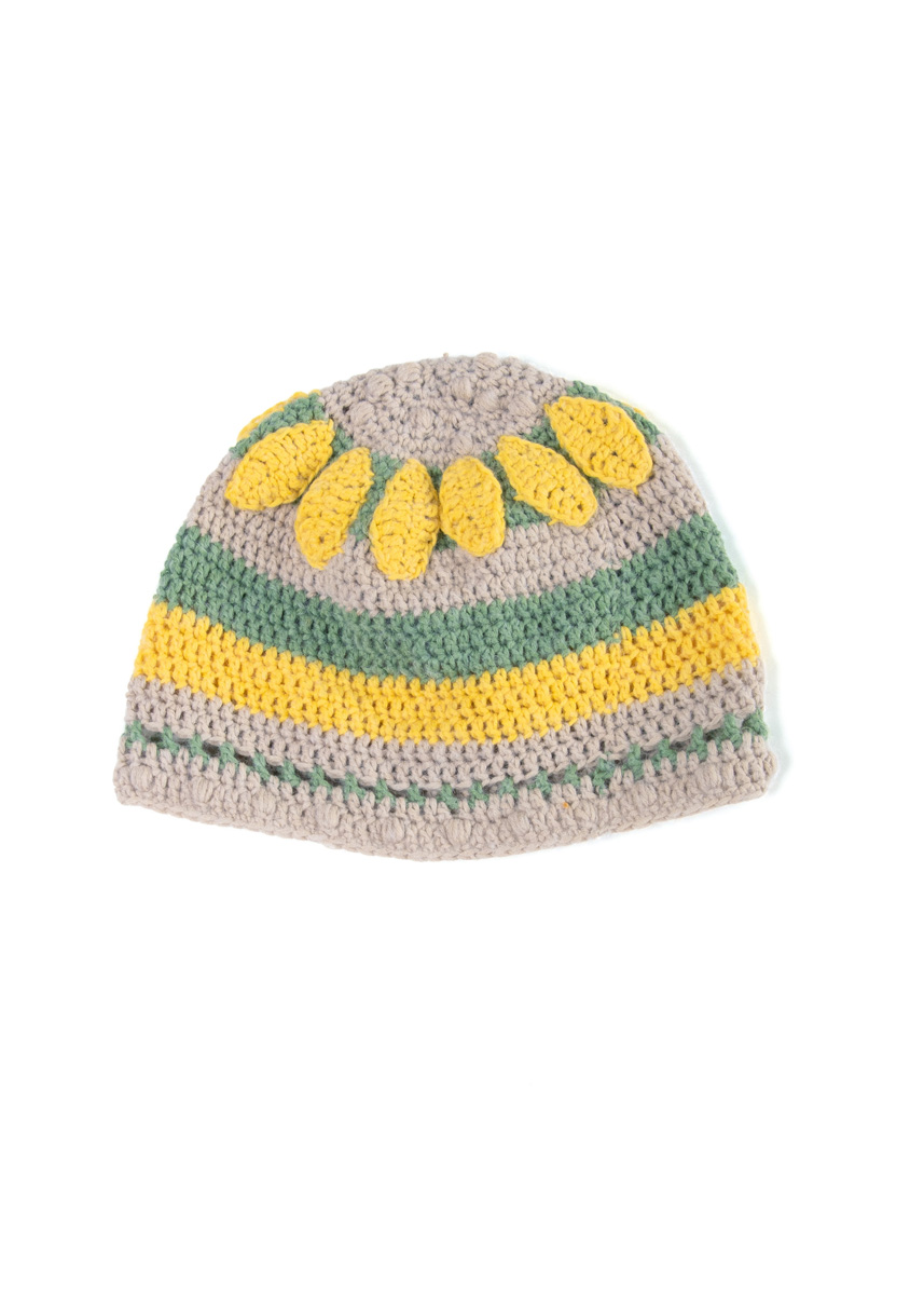 Lana Grossa Ecopuno (72% Baumwolle, 17% Schurwolle (Merino), 11% Alpaka (Baby); LL = 215 m/50 g): je 50 g Resedagrün (Fb. 20), Sandbeige (Fb. 64) und Gelb (Fb. 95); eine Häkelnadel 3,5 mm.