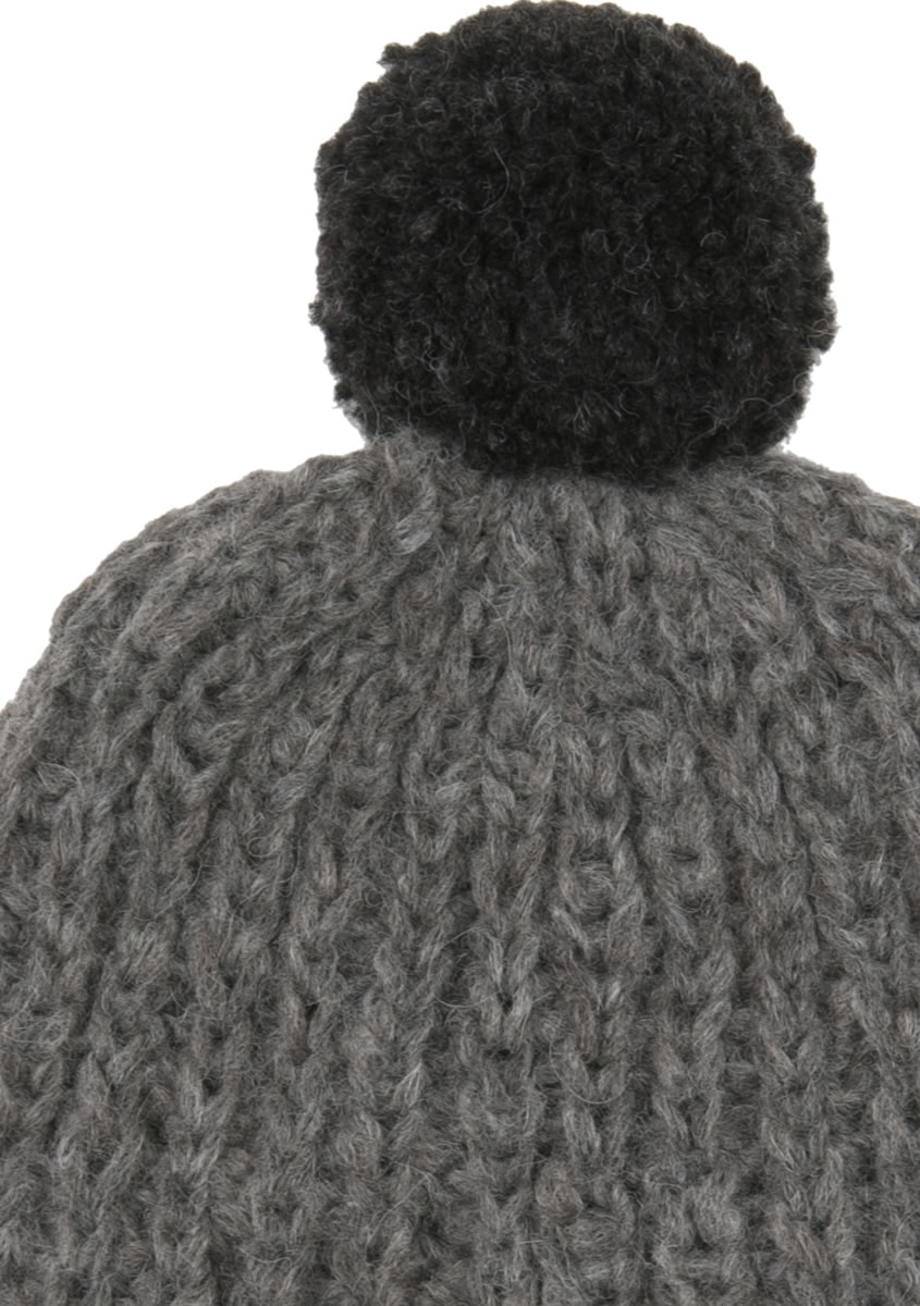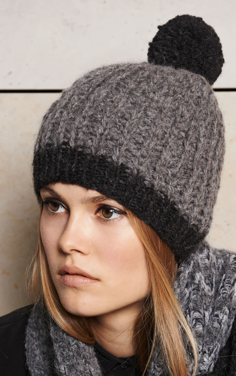 Lana Grossa Qualität „Garzato Fleece“ (70 % Alpaka, 30 % Polyamid, Lauflänge 225 m/50 g): je ca. 50 g Grau/Schwarz (Fb 10) und Schwarz/Anthrazit (Fb 9), Spielstricknadeln Nr. 6,5, ein Pomponset.