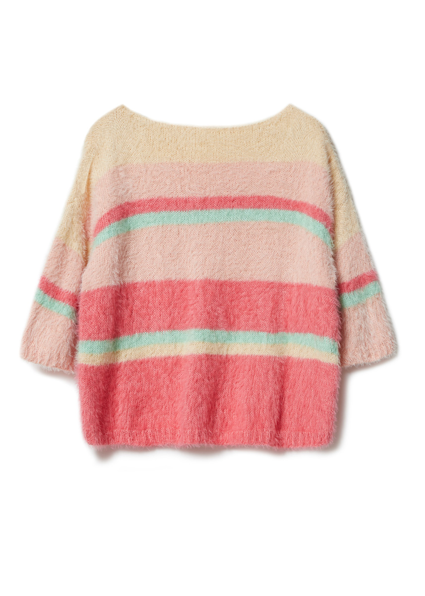 Dieser Pulli schmeichelt mit einem leichten Flauschgarn und Streifen in sommerlichen Sorbet- Tönen. Glatt rechts gestrickt, ein ideales Anfänger-Piece.
