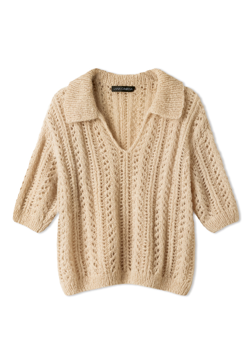 Miniperlen, Ajour-Strukturen und ein sportlicher Polokragen – ein perfekter Mix aus entspannt und chic. Unkompliziert: Der Ausschnitt des Shirts besteht aus einem einfachen Schlitz.