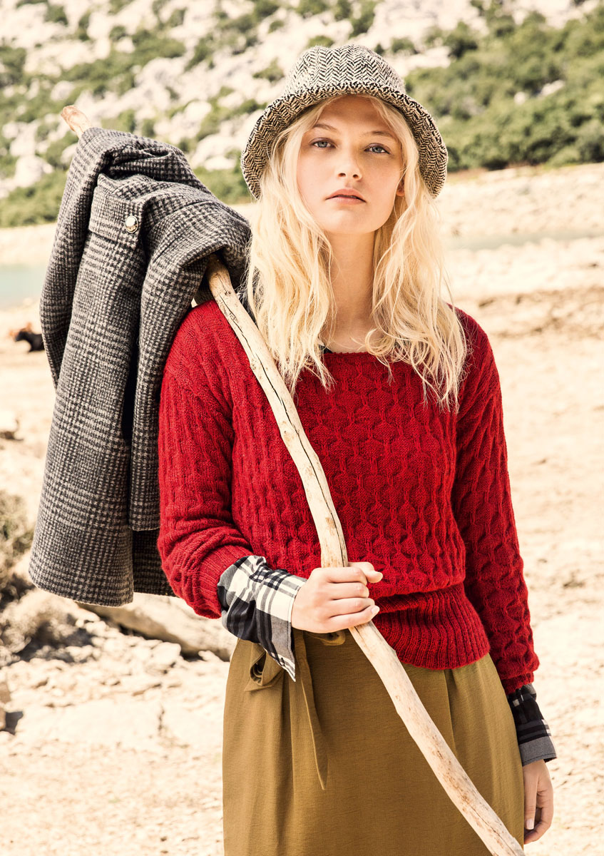 Lana Grossa Alpaca Peru 200 (100 % Alpaka, Lauflänge 200 m/50 g); 400 (450 – 500) g Rot (Fb 204); Stricknadeln Nr. 3 und 3,5, Häkelnadel Nr. 3.