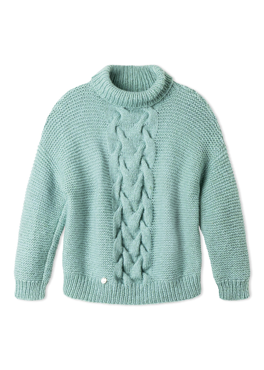 Lana Grossa-Qualität „Alta Moda Cashmere 16” (78 % Schurwolle (Merino), 12 % Kaschmir, 10 % Polyamid, LL = ca. 110 m/50 g): ca. 550 (600 – 650) g Minttürkis (Fb. 34); Stricknadeln Nr. 7 und 8, 1 Rundstricknadel Nr. 7, 50 cm lang.