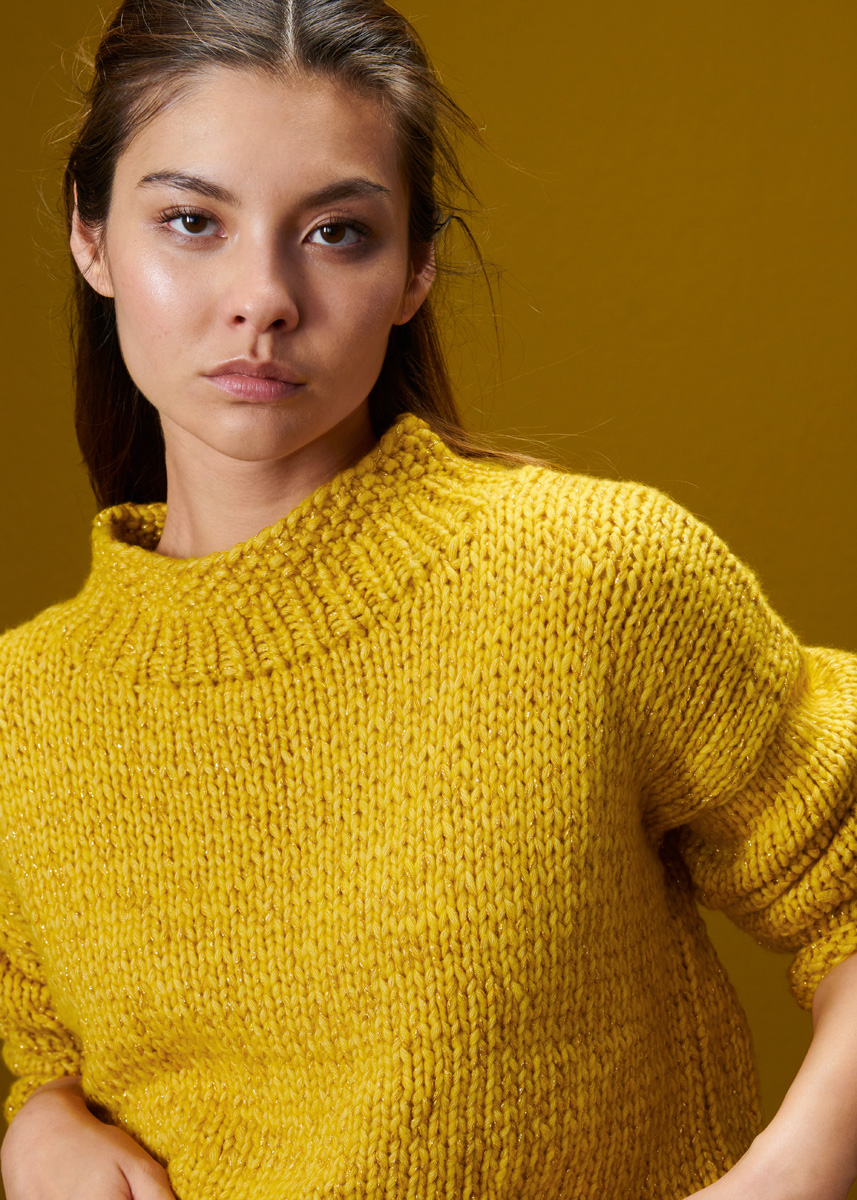 Sattes Gelb, voluminöses Garn, Lurex und ein weiter Turtleneck: Dieser Pulli bedient gleich vier Top-Trends auf einmal. Ein Hingucker sind auch die Blenden, die mit Perlmuster abschließen.
