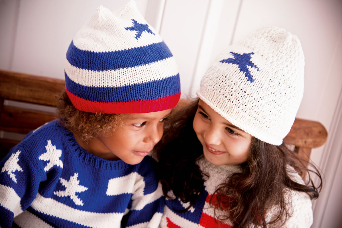 Weißt du was, die haben sich beim Stricken doch tatsächlich von den amerikanischen „Stars & Stripes” inspirieren lassen! Coole Socken, coole Mützen, coole Pullis = coole Kids!