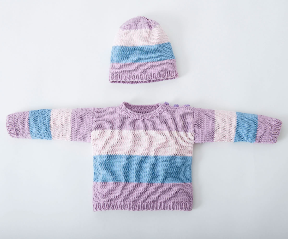 Lana Grossa Wakame (75 % Baumwolle, 25 % Viskose, Lauflänge 125 m/50 g) je 50 g Flieder (Fb 20), Zartrosa (Fb 19) und Hellblau (Fb 21); Stricknadeln Nr. 3,5, eine 40 cm lange Rundstricknadel Nr. 3,5, Spielstricknadel Nr. 3.5, Häkelnadel Nr. 3,5, drei Knöpfe.