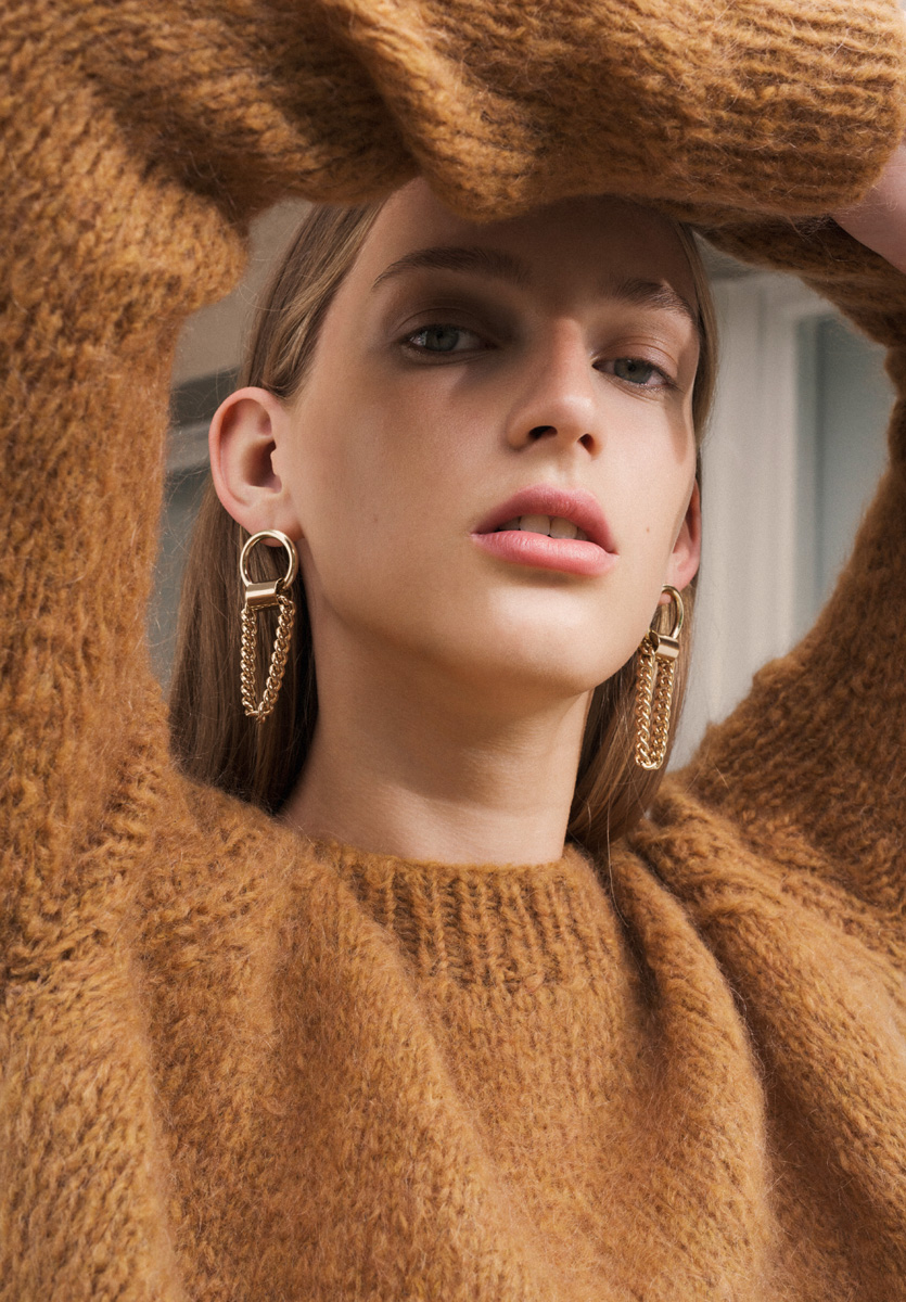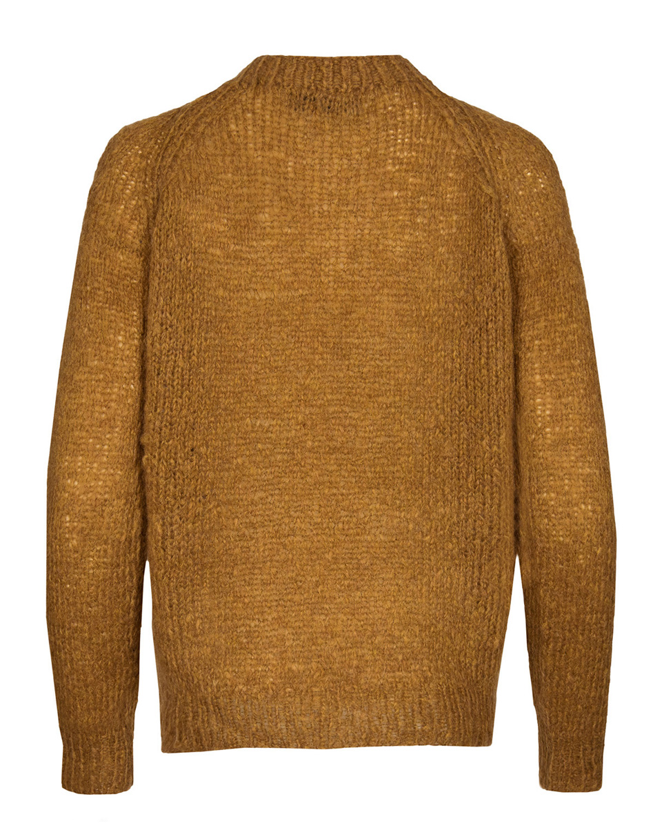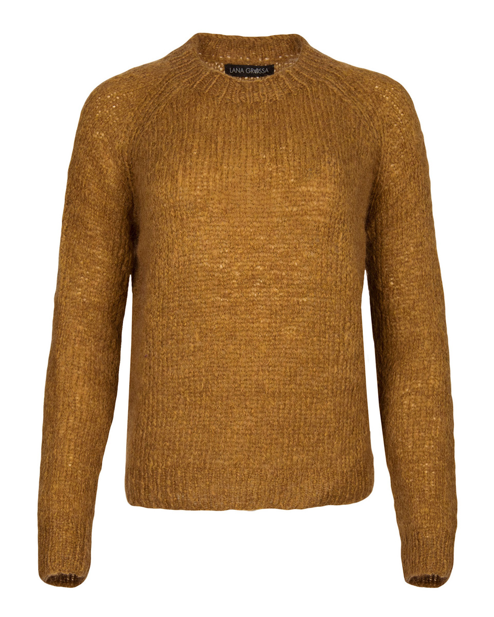 Lana Grossa Peloso (54 % Schurwolle, 26 % Mohair, 20 % Polyacryl, Lauflänge 210 m / 50 g) 200 (250 – 300) g Goldbraun (Fb 7); Stricknadeln Nr. 3,5 und 5; eine 40 cm lange Rundstricknadel Nr. 3,5.