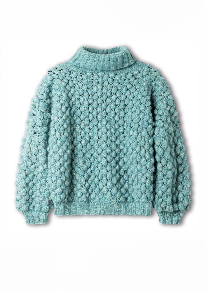XL-Noppen (supereinfach!) verleihen unserem mintgrauen Leichtgewicht eine spektakuläre Optik. Seine voluminöse Silhouette entsteht durch fest gestrickte Rippenbündchen.