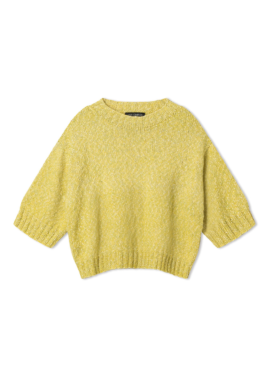 Lana Grossa-Qualität „Bottoni“ (53 % Baumwolle, 24 % Viskose, 23 % Schurwolle (Merino extrafine), LL = ca 125 m/50 g): ca 400 (400 - 450 - 450) g Zitrusgelb/Creme (Fb 19); Stricknadeln Nr 3,5 und 4,5; 1 kurze Rundstricknadel Nr 3.