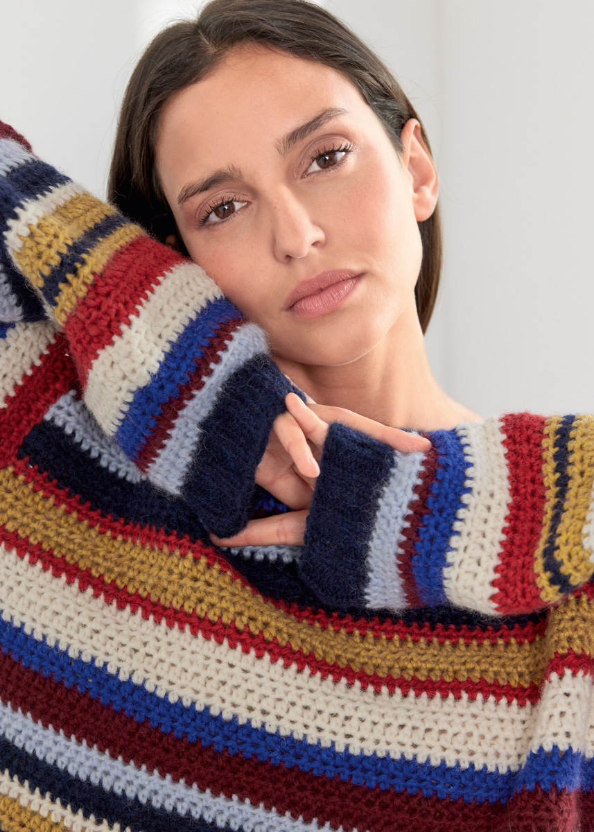 Crochet-Looks sind jetzt auch Wintersache. Der Streifen- Pullover in einfacher Kastenform wird in halben Stäbchen gehäkelt.