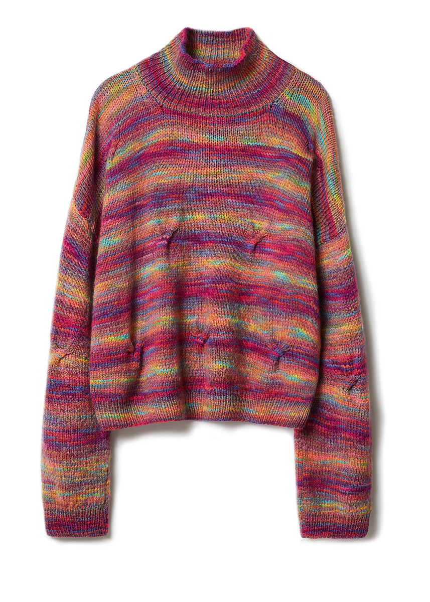 Lana Grossa-Qualität „Cool Merino Color“ (90 % Schurwolle (Merino), 10 % Polyamid, LL = ca 150 m/50 g): ca 450 (500 - 550 - 600) g Dunkelfuchsia/ Rost/Graublau/Pink/Dotter-/Senfgelb/Royal/Türkis/Gelbgrün/ Orange/Pink (Fb 315); Stricknadeln Nr 4 und 6; 1 Zopfnadel; 1 kurze Rundstricknadel Nr 4.