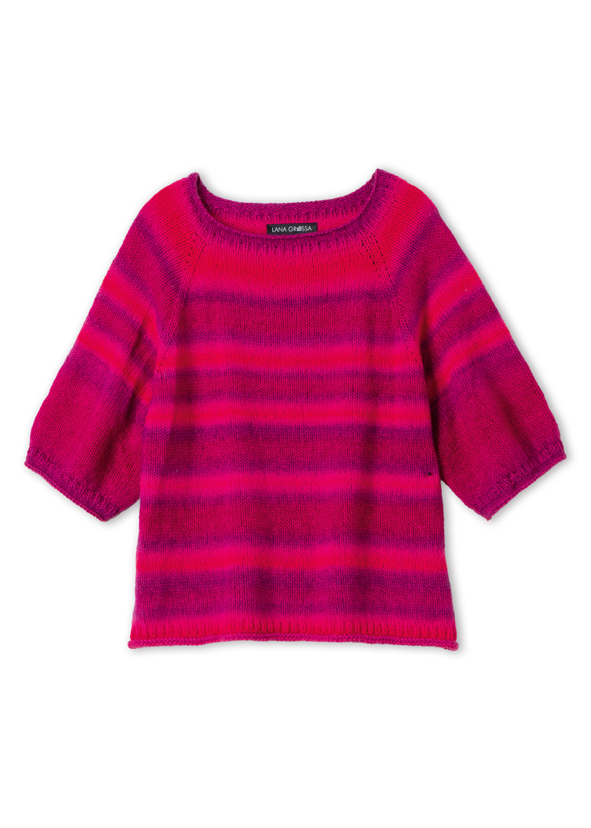 Lana Grossa-Qualität „Corallo“ (70 % Baumwolle (Bio), 30 % Schurwolle (Merino), LL = ca 210 m/100 g): ca 400 (400 - 500 - 500) g Rotviolett/Fuchsia/Pink (Fb 4); kurze und lange Rundstricknadel Nr 4, Nr 4,5 und Nr 5; Nadelspiel Nr 4, Nr 4,5 und Nr 5; Maschenmarkierer.