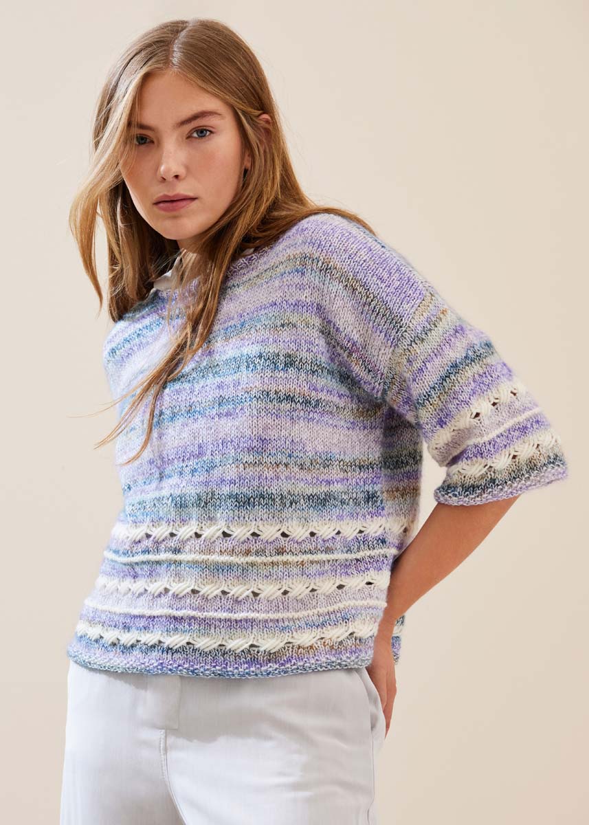 Lana Grossa-Qualität „Summer Softness“ (80 % Baumwolle (Bio), 20 % Schurwolle (Merino Superfine), LL = ca 130 m/50 g): ca 50 (50 - 100 - 100) g Creme (Fb 2); Lana Grossa-Qualität „Ecopuno“ (72% Baumwolle, 17% Schurwolle (Merino), 11% Alpaka (Baby), LL = ca 215 m/50 g): ca 200 (250 - 250 - 300) g Weiß (Fb 26); Lana Grossa-Qualität „Cottonhair“ (70 % Mohair (Superkid), 30 % Baumwolle, LL = ca 450 m/50 g): ca 100 (100 - 150 - 150) g Ocker/Hellgrau/Lila/ Rosé/Jeansblau/Anthrazit (Fb 104); Stricknadeln Nr 4 und 4,5; 1 kurze Rundstricknadel Nr 4.