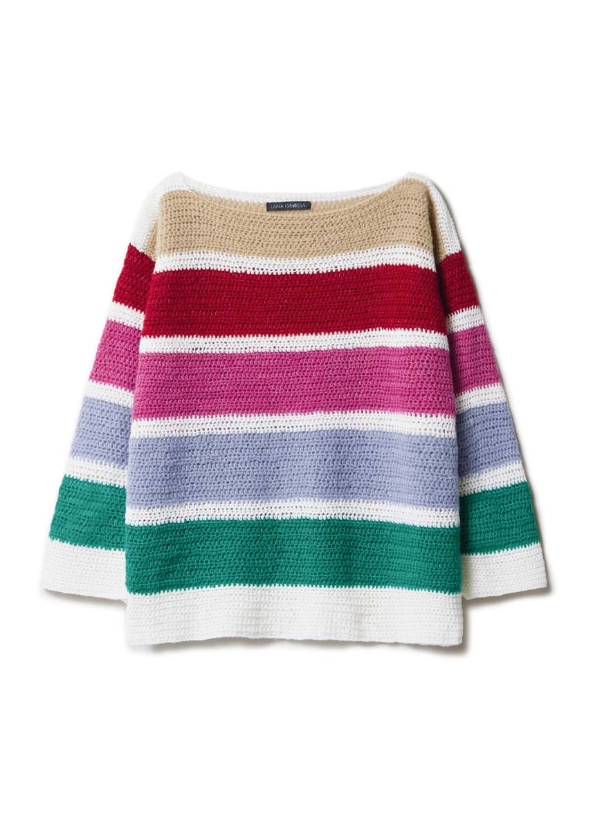 Bunte Blockstreifen, aufgelockert mit viel frischem Weiß: Jawoll, Gehäkeltes kann auch sportlich