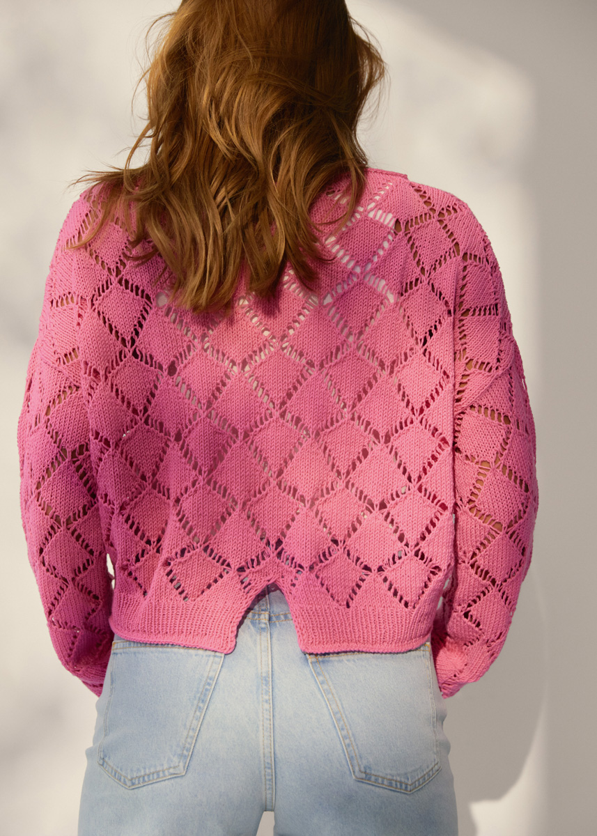Cropped, oversized und dezent strukturiert beweist dieser Pulli, dass Ajour-Muster auch sportlich können. Bemerkenswert sind auch die Details: Rollränder für die Kanten und ein rückwärtiger Schlitz.