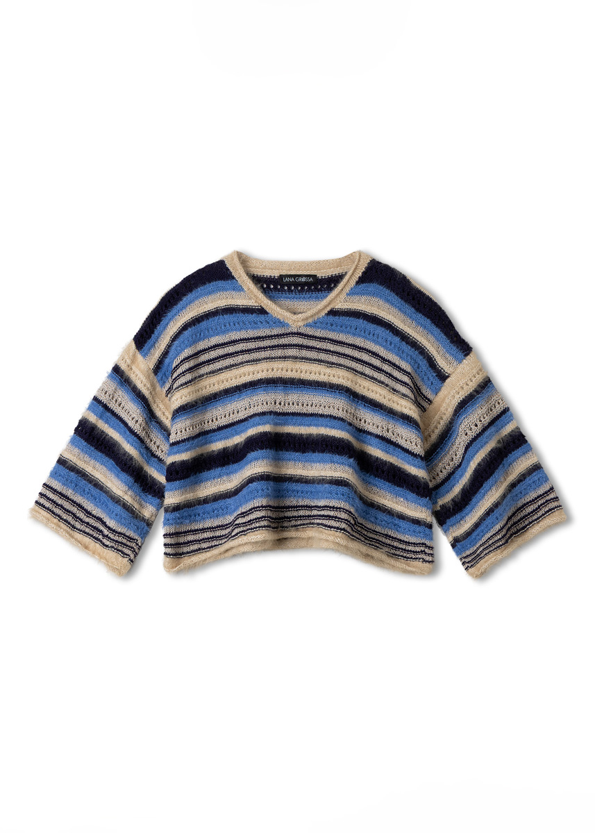 PULLOVER und SHORTS zeigen einmal mehr, wie sich simple Streifen zu etwas spannend Neuem fügen: glatt kontrastiert mit flauschig, das Lochmuster mit rechts und links gestrickten Passagen, dazwischen schimmernde Pailletten. Schon solo splendida – aber im Duo fantastico!