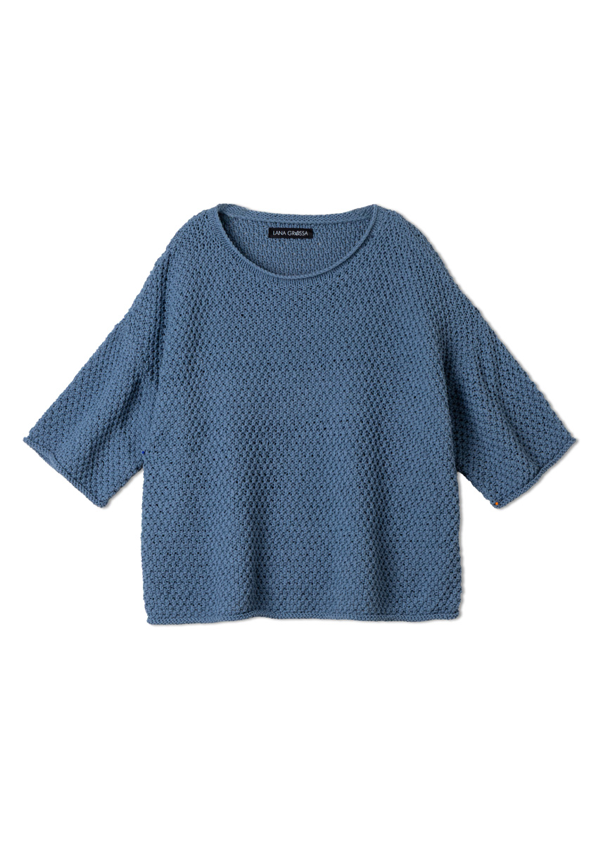 Lana Grossa Gioia (75% Baumwolle, 25% Rec. Polyamid, LL = ca. 110 m/50 g), 450 (500 – 550) g Jeans (Fb. 10); Stricknd Nr. 4 und Nr. 4,5 sowie eine 40 cm lange Rundstricknd Nr. 4.