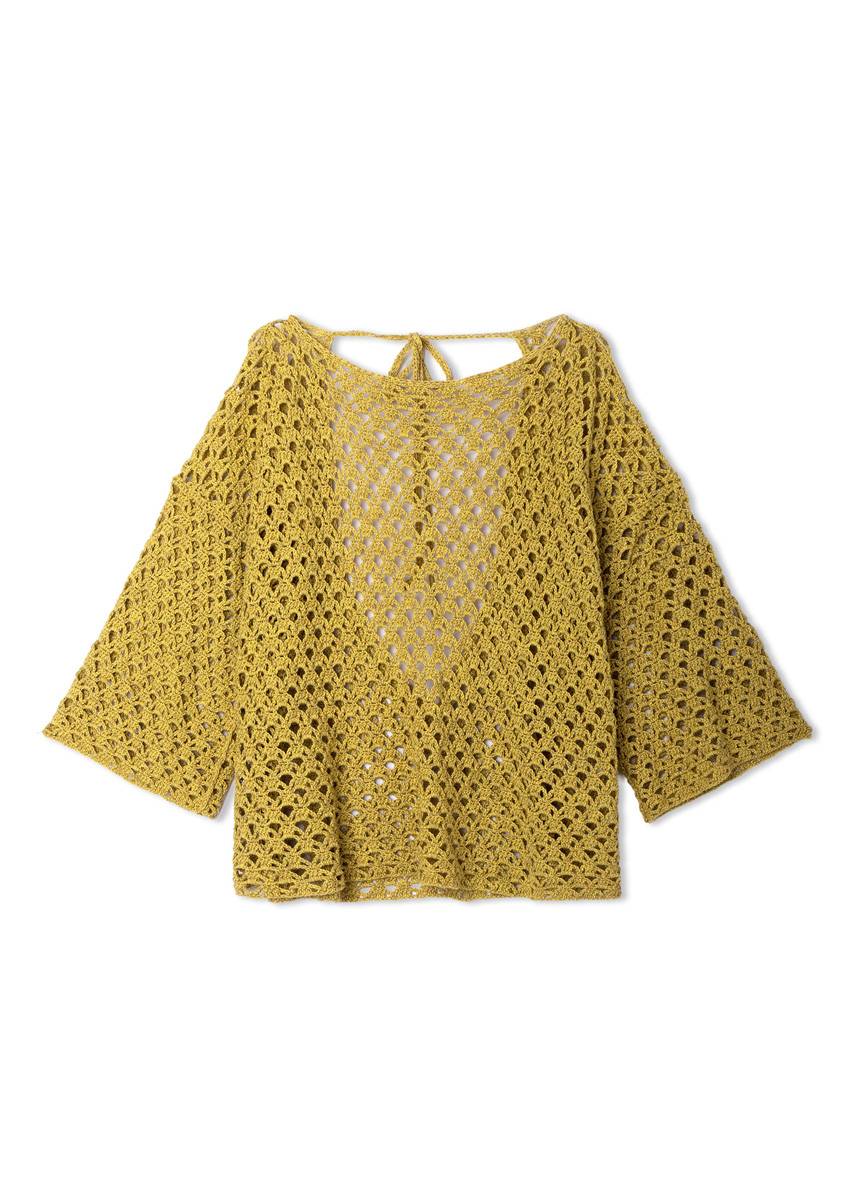 Der Pullover im durchbrochenen Stäbchenlochmuster überrascht mit einem tiefen Rückendekolletee. Perfetto: Für kühle Momente gibt es das passende Dreieckstuch.