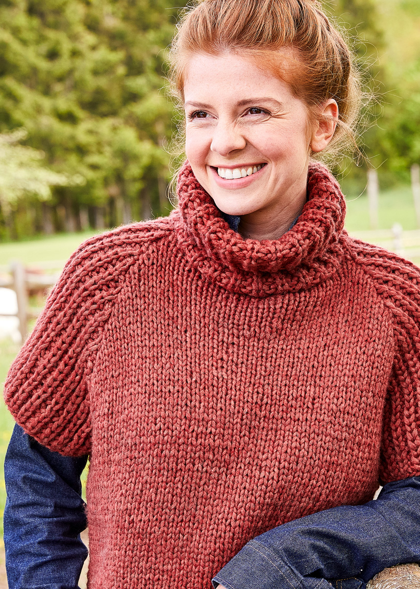 Lana Grossa-Qualität „Landlust Winterwolle“ (50% Schurwolle Merino, 35% Baumwolle, 15% Yak, LL ca. 70 m/50 g), 400 (450 - 500 - 550) g in Terrakotta Meliert (Fb 16); Stricknadeln Nr. 6 und Nr. 7, 1 Rundstricknadel Nr. 6, 40 cm lang.