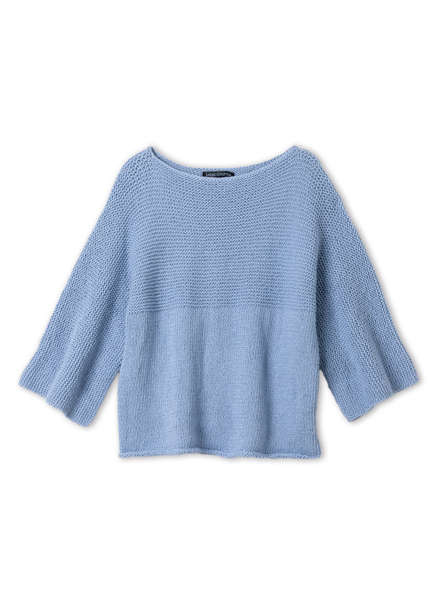 Lana Grossa-Qualität „Summer Softness“ (80 % Baumwolle (Bio), 20 % Schurwolle (Merino superfine), LL = ca 130 m/50 g): ca 450 (500 - 550 - 600) g Hellblau (Fb 30); Stricknadeln Nr 5,5.