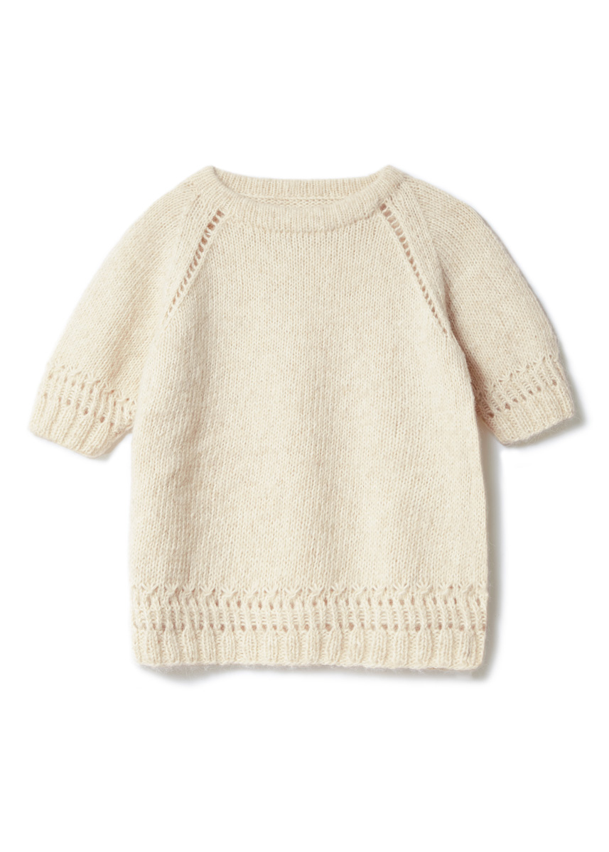 Unsere extravagante Alternative zum klassischen Twin-Set präsentiert sich mit feinen Lochmusterbordüren und einer Stola statt Jacke. Der Pullover hat betonte Raglanschrägen und eine kompakte, doppelte Ausschnittblende.