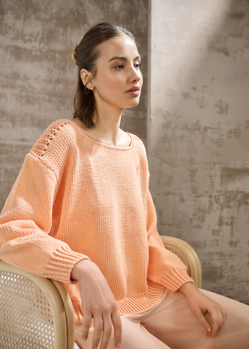Lana Grossa Natural Cotton (100% (Bio) Baumwolle, Lauflänge 80 m/50 g), 650 (700 – 750) g Apricot (Fb. 23); Stricknadeln Nr. 5 und 5,5, sowie 1 Häkelnadel Nr. 4,5.
