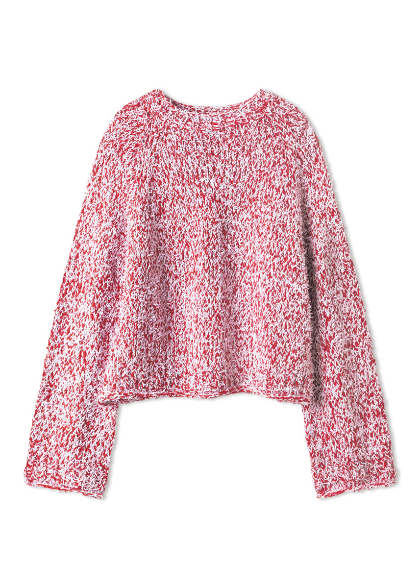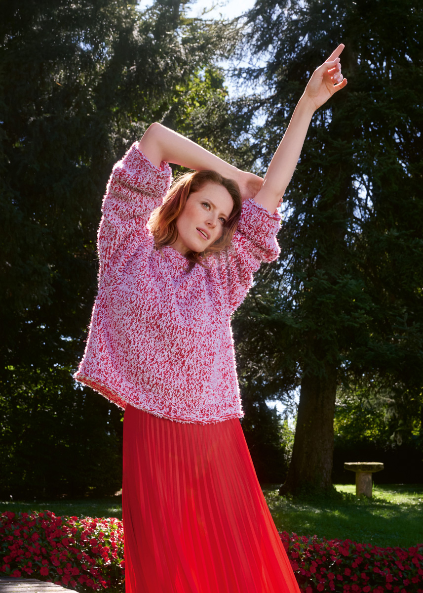 Lana Grossa-Qualität „Summer Softness“ (80 % Baumwolle (Bio), 20 % Schurwolle (Merino superfine), LL = ca 130 m/50 g): ca 300 (350 - 350 - 400) g Rot (Fb 7); Lana Grossa-Qualität „Frizzante“ (54 % Baumwolle, 46 % Polyamid, LL = ca 105 m/50 g): ca 300 (300 - 350 - 350) g Weiß (Fb 16); kurze und lange Rundstricknadel Nr 7 und Nr 9; Maschenmarkierer.