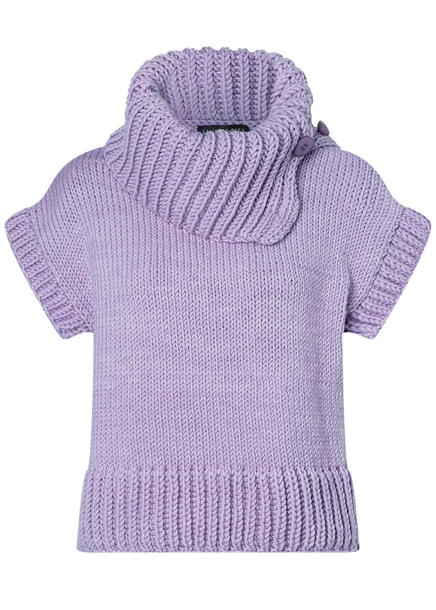 Lana Grossa Superbingo (100% Schurwolle (Merino), Lauflänge 55 m/50 g), 750 (800 – 850) g Flieder (Fb 109); Stricknadeln Nr. 7, je 1 Rundstricknadel Nr. 6 und 7, 40 cm lang, 3 Knöpfe von UNION KNOPF, Fb Flieder, Gr. 25 mm.