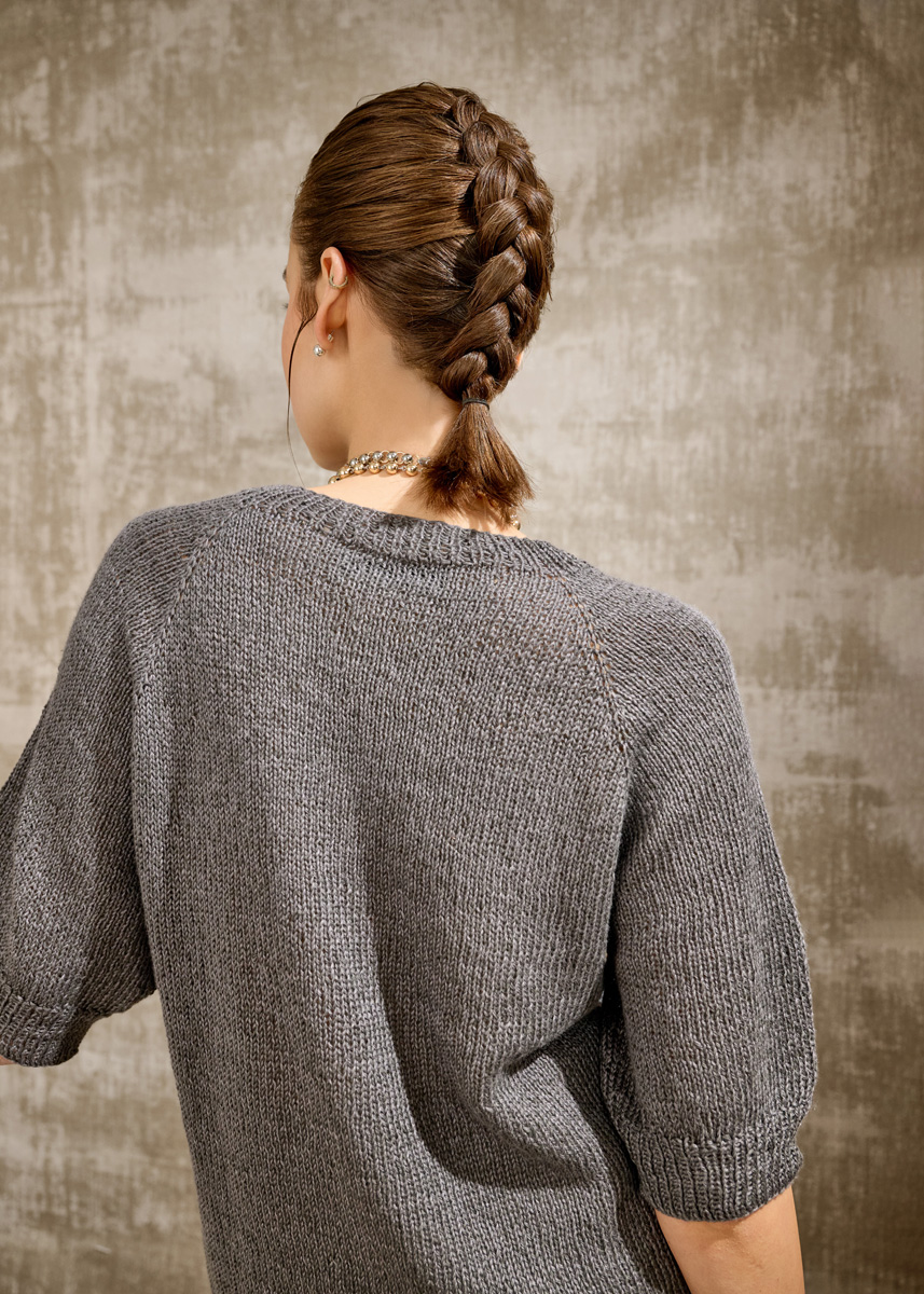 Lana Grossa Tencellino (51% Leinen, 49% Tencel, Lauflänge 125 m/50 g), 350 (400 – 450) g Anthrazit (Fb. 16); je 1 Rundstricknadel Nr. 3, 40 und 60 cm lang und je 1 Rundstricknadel Nr. 4, 40, 60 und 80 cm lang, sowie 4 Maschenmarkierer.