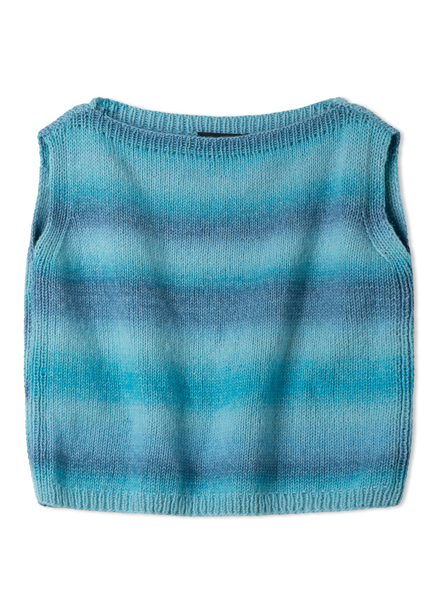 Lana Grossa-Qualität „Corallo“ (70 % Baumwolle (Bio), 30 % Schurwolle (Merino), LL = ca 210 m/100 g): ca 300 (300 - 400 - 400) g Helltürkis/Türkis/Jeans (Fb 7); Stricknadeln Nr 4 und Nr 4,5.