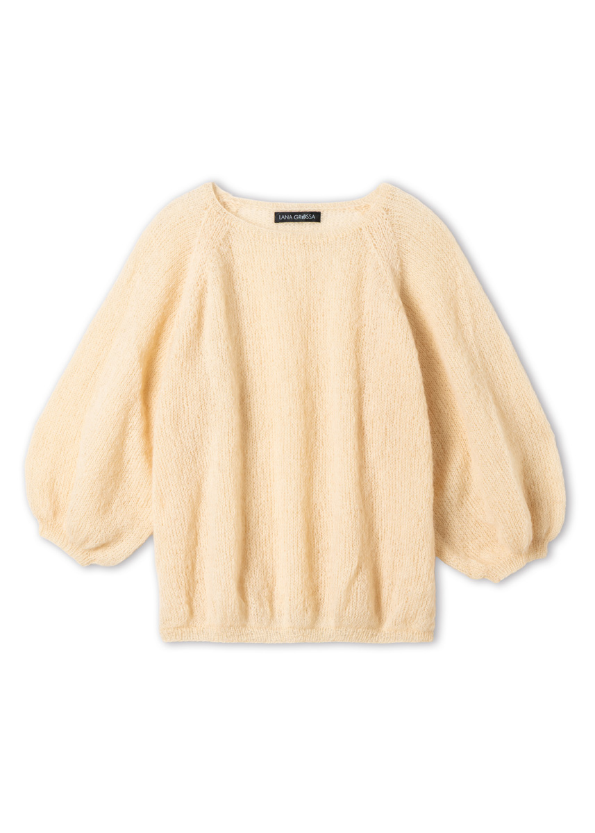 Lana Grossa-Qualität „Setasuri“ (69 % Alpaka (Suri), 31 % Seide, LL = ca 212 m/25 g): ca 150 (150 - 175 - 175) g Hellbeige (Fb 58); Stricknadeln Nr 3,5 und 4; 1 kurze Rundstricknadel Nr 3,5.