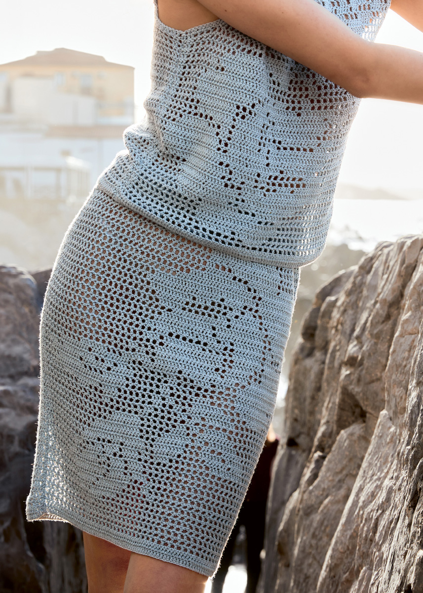 Molto elegante: Das halbtransparente Ensemble aus Turtleneck-Top und Stiftrock im floralen Filetmuster – SOLO LINO.