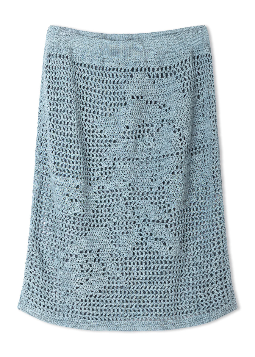 Lana Grossa-Qualität „Solo Lino” (80 % rec. Leinen (Viskose), 20 % Leinen, LL = ca. 120 m/50 g): ca. 350 (400) g Hellblau (Fb. 46); 1 Wollhäkelnadel Nr. 3,5, 1 Rundstricknadel Nr. 3,5, 60 cm lang; ca. 65 (70) cm weißes Gummiband, 2 cm breit.