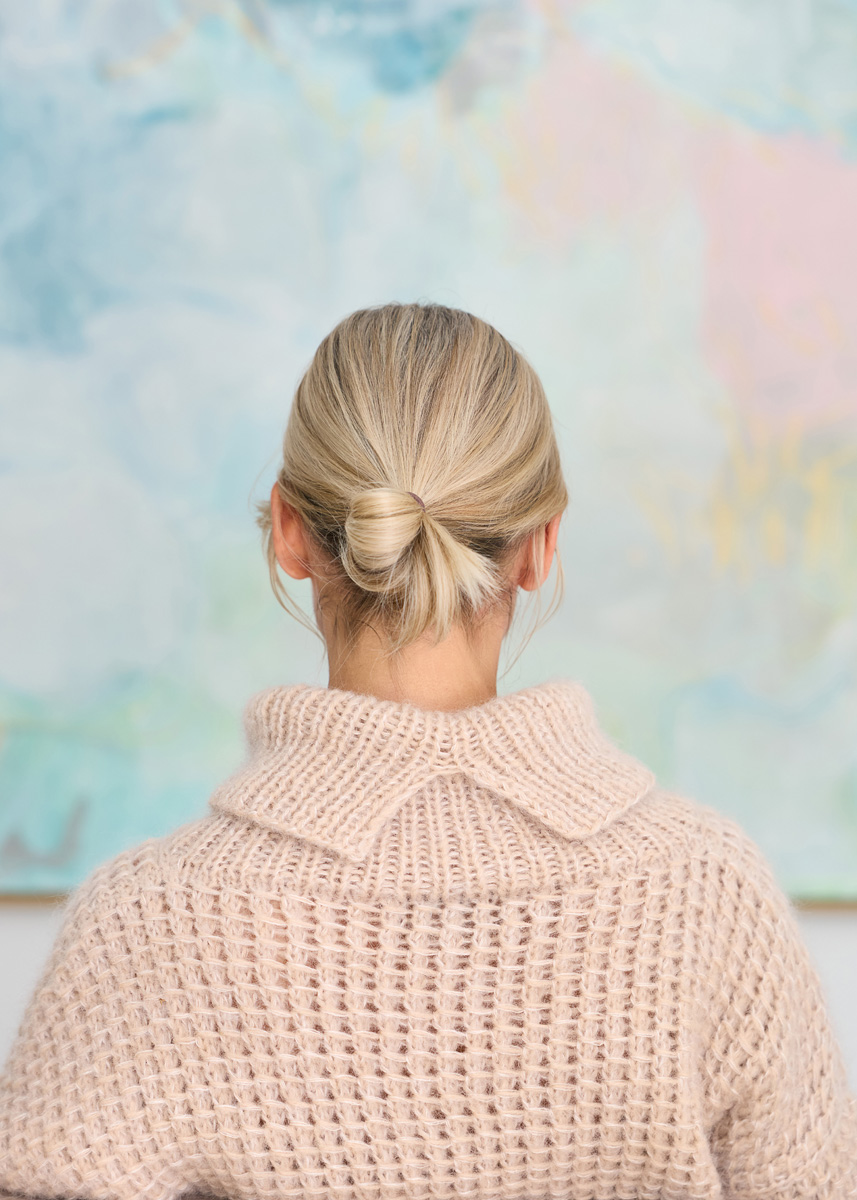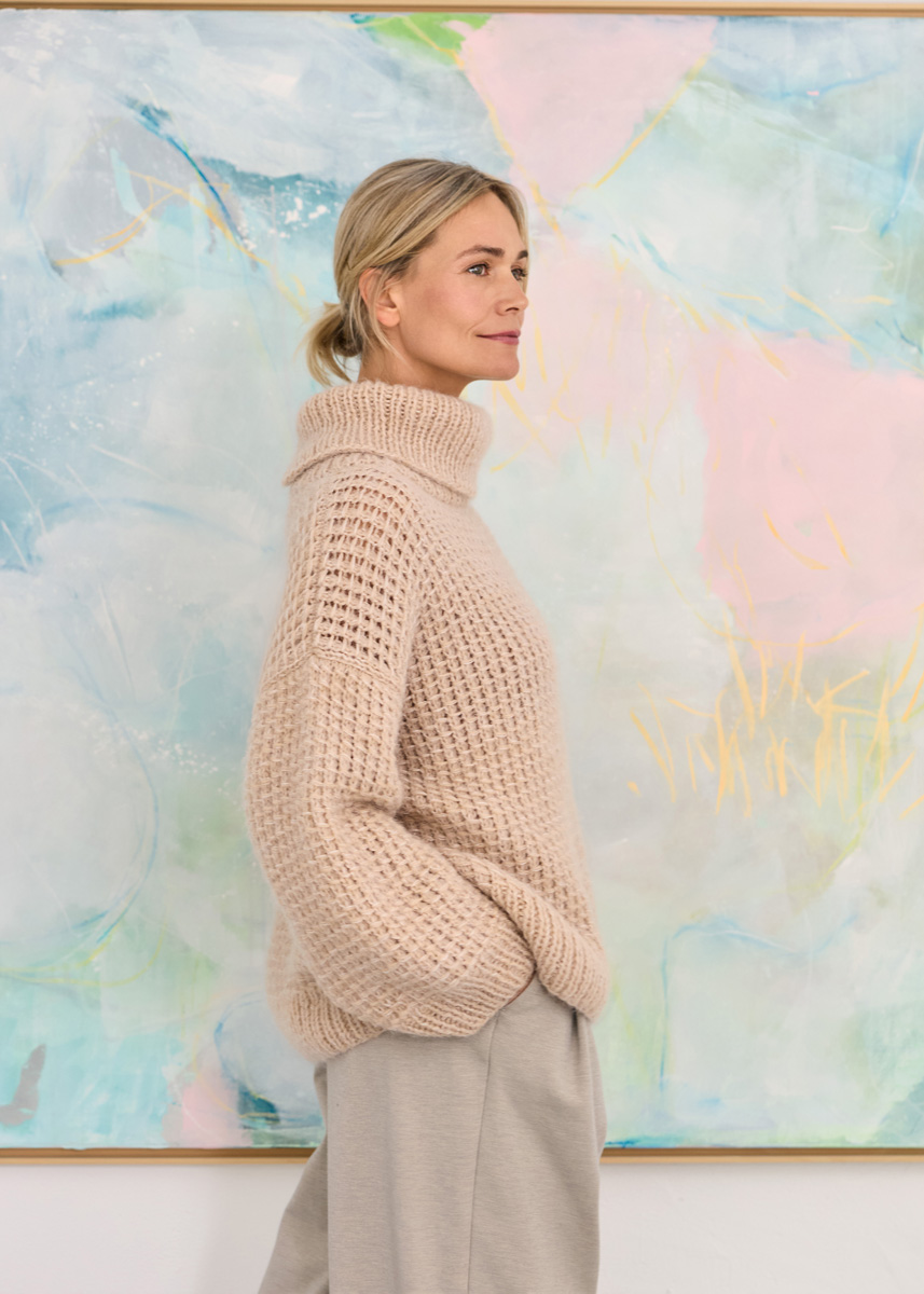 Lana Grossa-Qualität „Nebbia” (55 % Schurwolle (Merino extrafine), 45 % (Baby) Alpaka, LL = ca. 170 m/50 g): ca. 350 (400 – 450) g Beige (Fb. 13) und Lana Grossa- Qualität „Silkhair” (70 % Mohair (Superkid), 30 % Seide, LL = ca. 210 m/25 g): ca. 250 (275 – 300) g Hellbeige (Fb. 18); Stricknadeln Nr. 6,5 und 7, 1 Rundstricknadel Nr. 7, 50 cm lang.