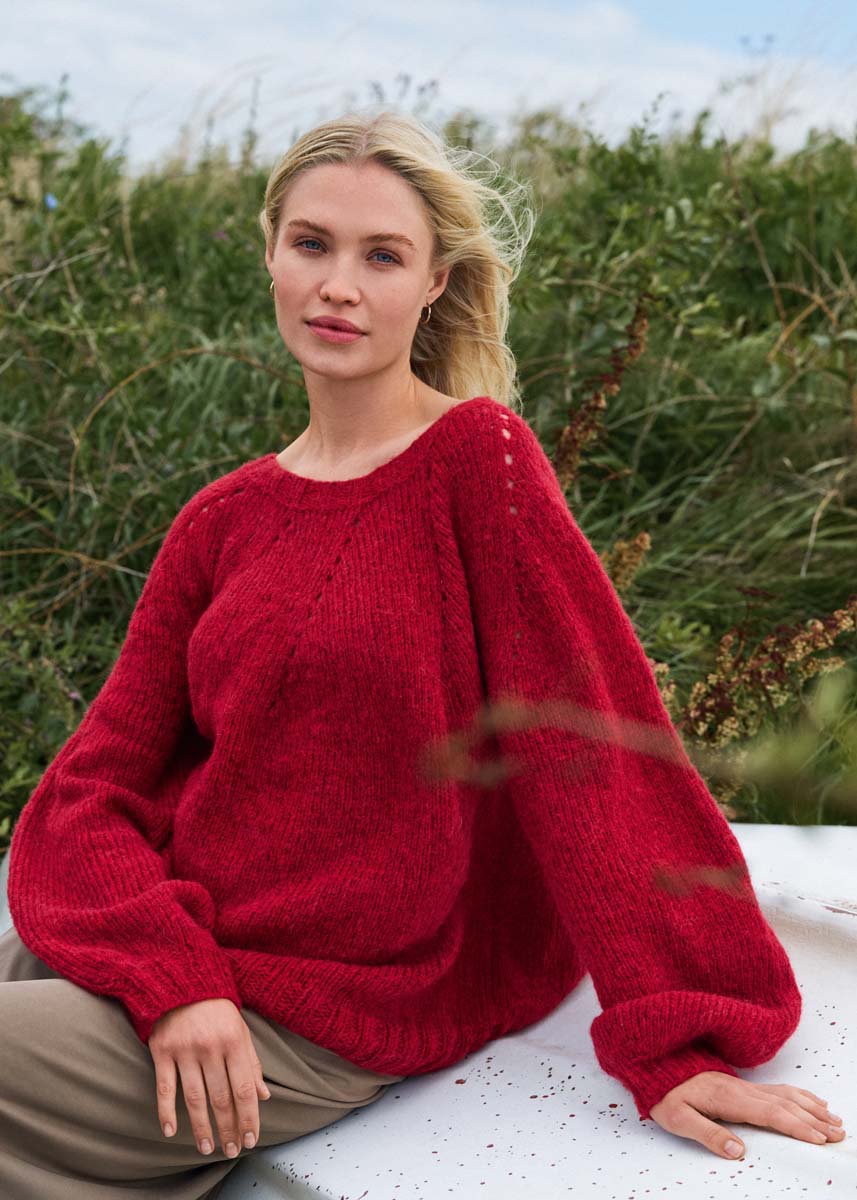 Lana Grossa Airy (42 % Alpaka (Baby), 40 % Baumwolle, 18 % Schurwolle (Merino), Lauflänge 170 m/50 g): 300 (350/400/450) g Kirschrot (Fb. 16); je eine kurze und eine lange Rundstricknadel 4,5 mm und 5 mm (Runden mit geringerem Umfang mit Magic-Loop-Methode arbeiten); Maschenmarkierer.