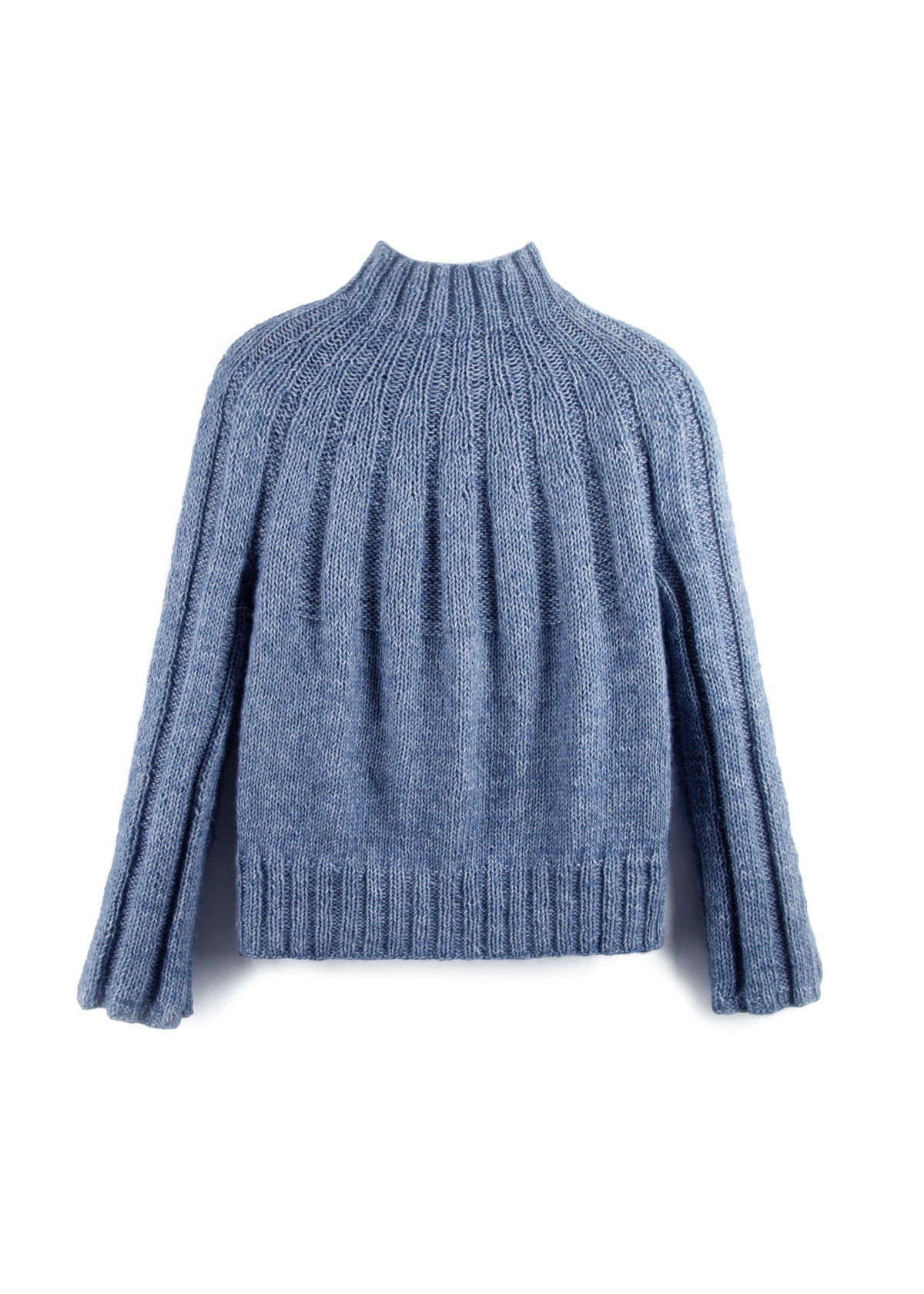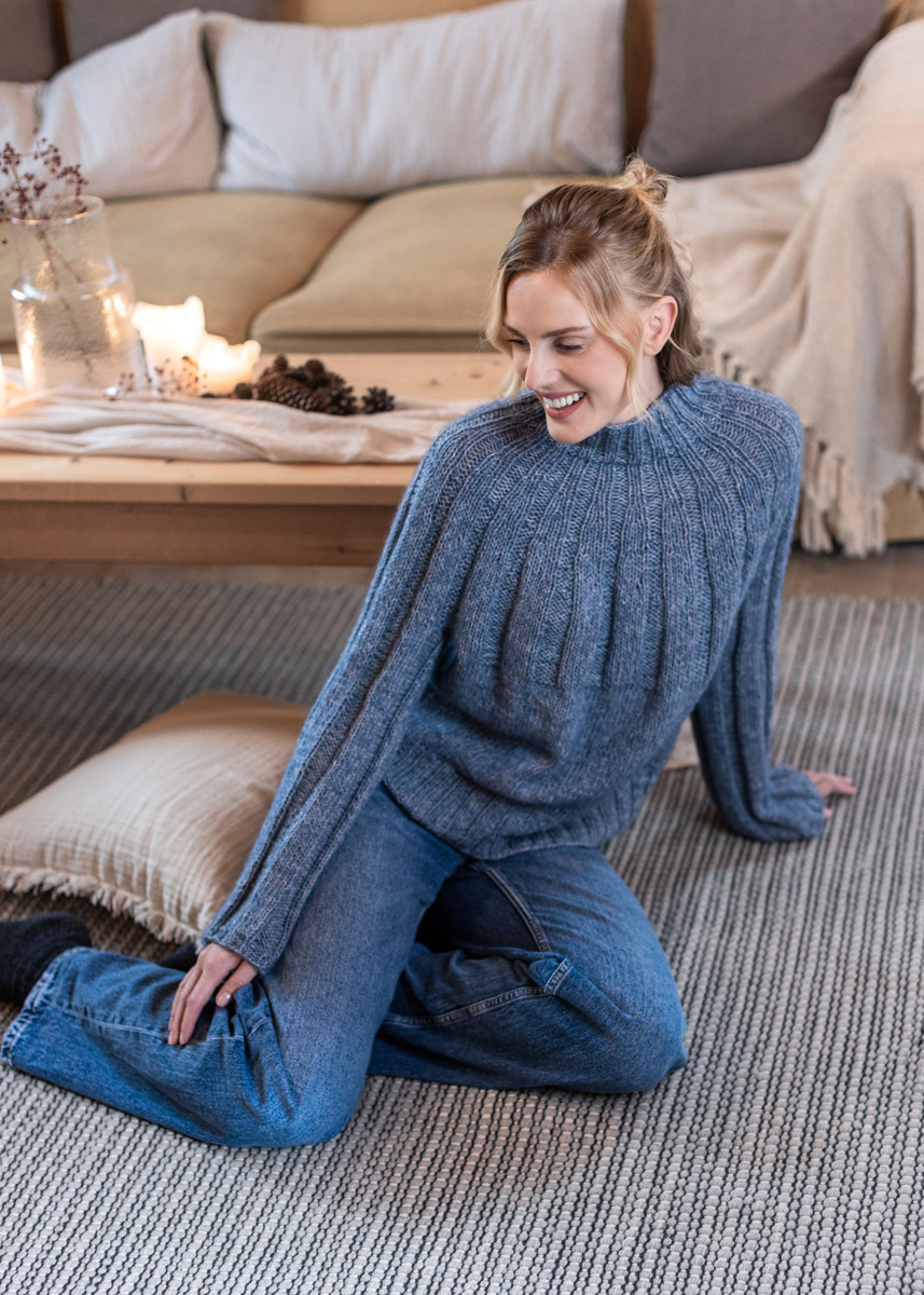 Der Pullover wird nahtlos in einem Stück von oben nach unten gestrickt. Er hat eine Gesamtlänge von 60 (62 - 64 - 66 - 68 - 70) cm und eine Brustmehrweite von 7 cm bei 80 cm Brustumfang (8,5 cm bei 88 cm Brustumfang - 8 cm bei 96 cm Brustumfang - 2,5 cm bei 104 cm Brustumfang - 1,5 cm bei 116 cm Brustumfang - 0 cm bei 128 cm Brustumfang).